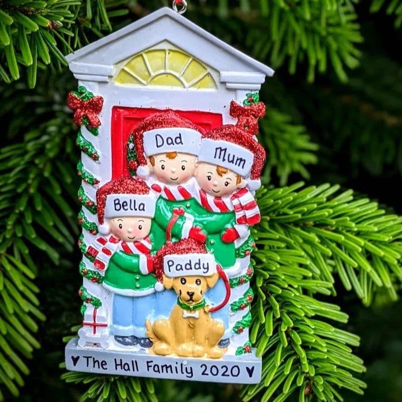 Personalised Family of 3 with Dog in Doorway Christmas Tree Decoration