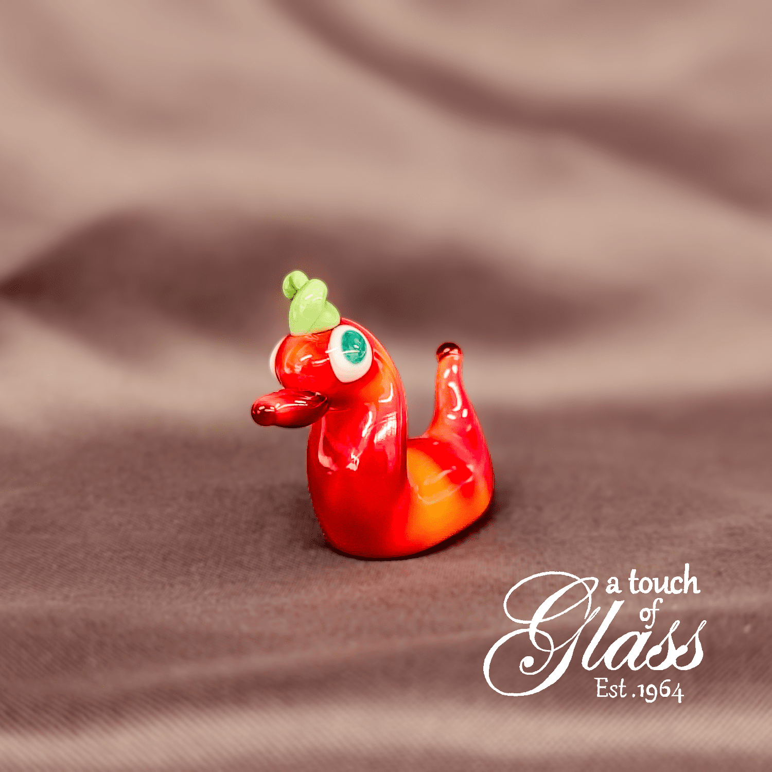 Specially made ducks in a pumpkin theme with a green twist, made in orange/red glass.
